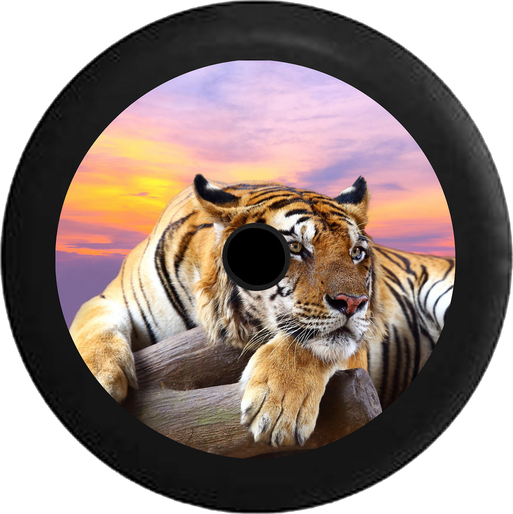 Jeep Wrangler JL Backup Camera Tiger Jungle Cat Sunset Sky on Log Jeep Spare Tire Cover BLACK- - R150