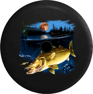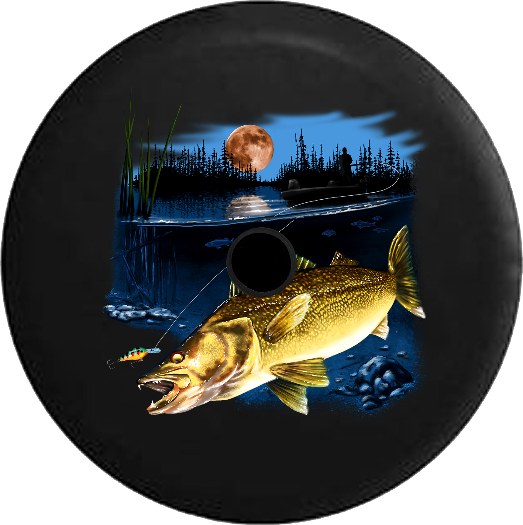 Jeep Wrangler JL Backup Camera Walleye Fish in the Lake Fishing Lure Night Full Moon RV Camper Spare Tire Cover-BLACK-