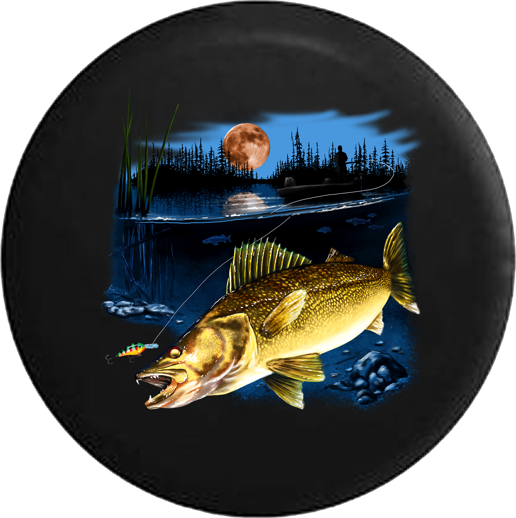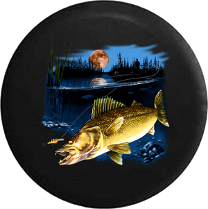 Walleye Fish in the Lake Fishing Lure Night Full Moon RV Camper Spare Tire Cover-BLACK- -V223