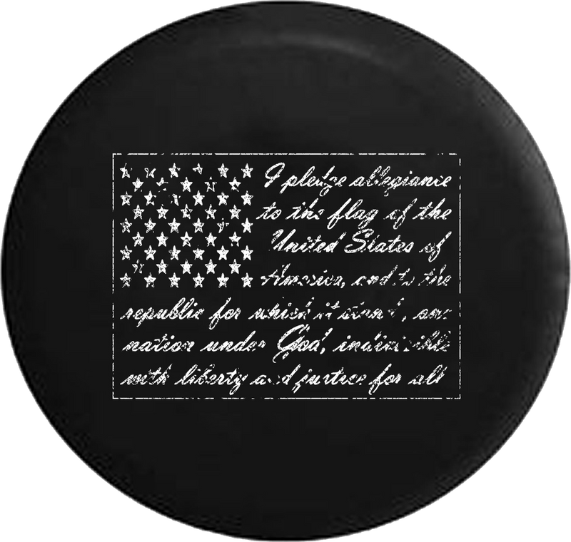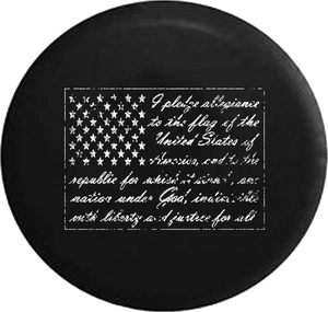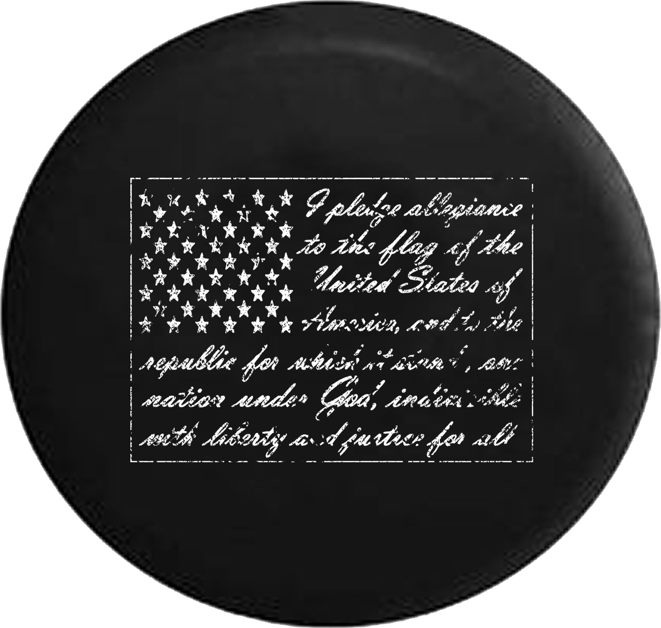What a great way to show the love you have for your country with this made in U.S.A Jeep Liberty Tire Cover With Distressed Pledge Print. Our tire covers come in different sizes to fit all Jeep?ÿLiberty spare tires such as?ÿ235/65R17, 245/50R20 and a lot more.