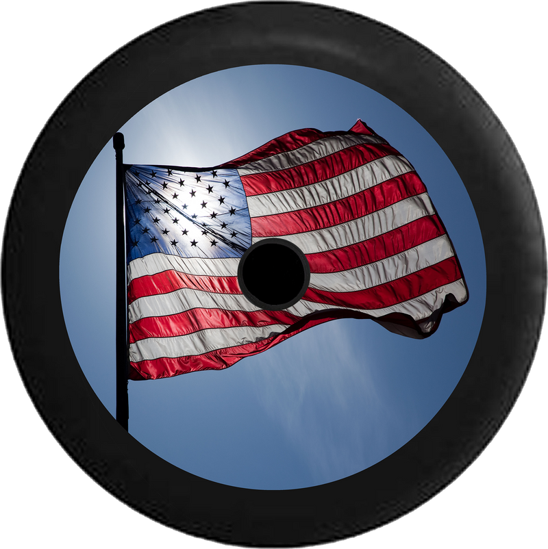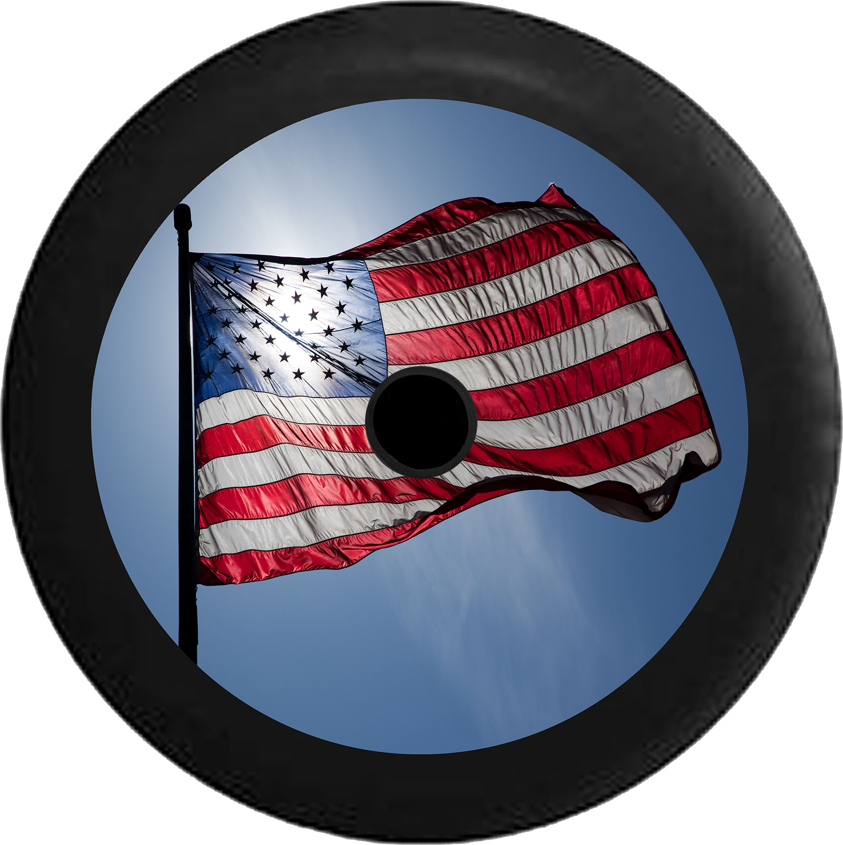 Jeep Wrangler JL Backup Camera American Flag Waving Sky Stars Stripes Military Patriotic Jeep Camper Spare Tire Cover BLACK- - R161