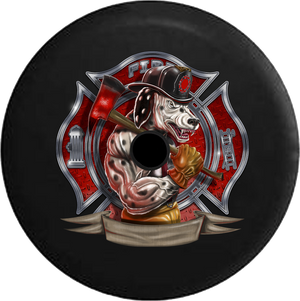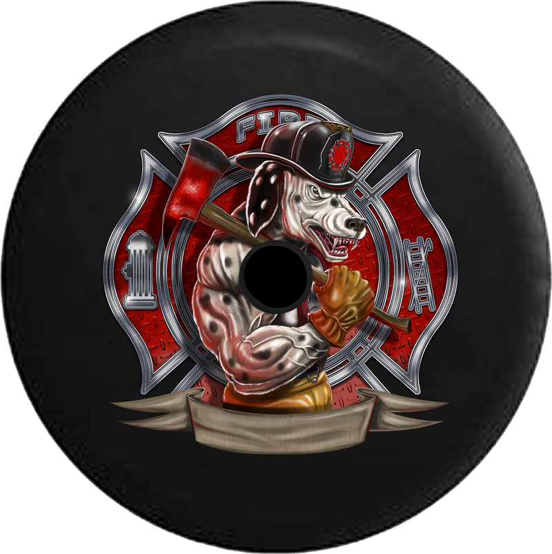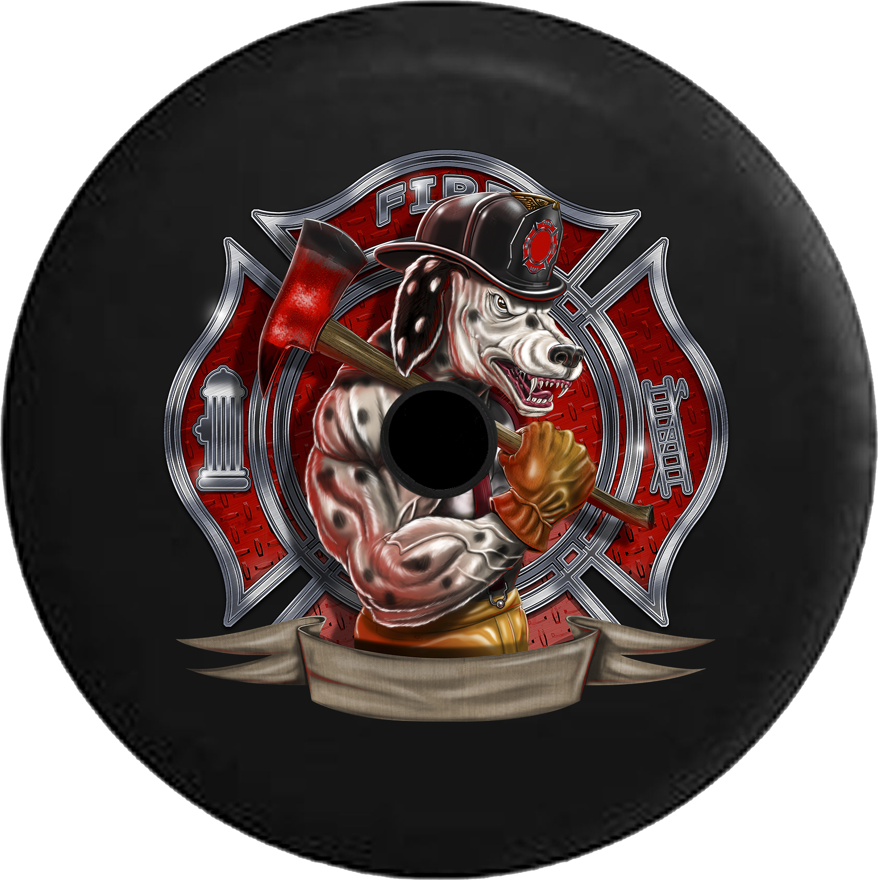 Jeep Wrangler JL Backup Camera Fire Dept Maltese Cross Muscle Dalmatian Dog Firefighter RV Camper Spare Tire Cover-BLACK-