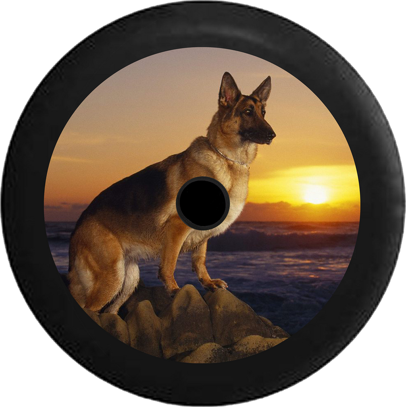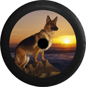 Jeep Wrangler JL Backup Camera German Sheppard Dog perched on Rocks Sunset Jeep Camper Spare Tire Cover BLACK- - R141