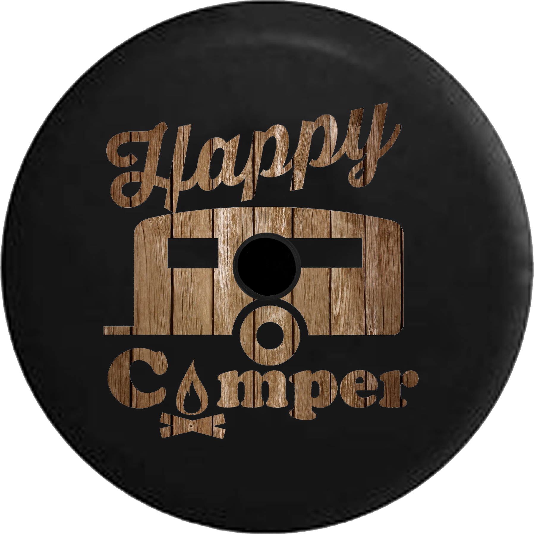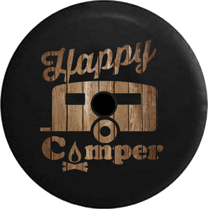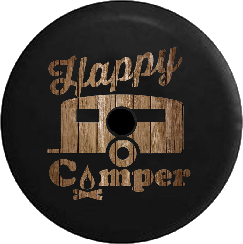 Jeep Wrangler JL Backup Camera Happy Camper Campfire Distressed Wood Spare Tire Cover-BLACK-