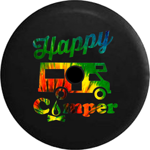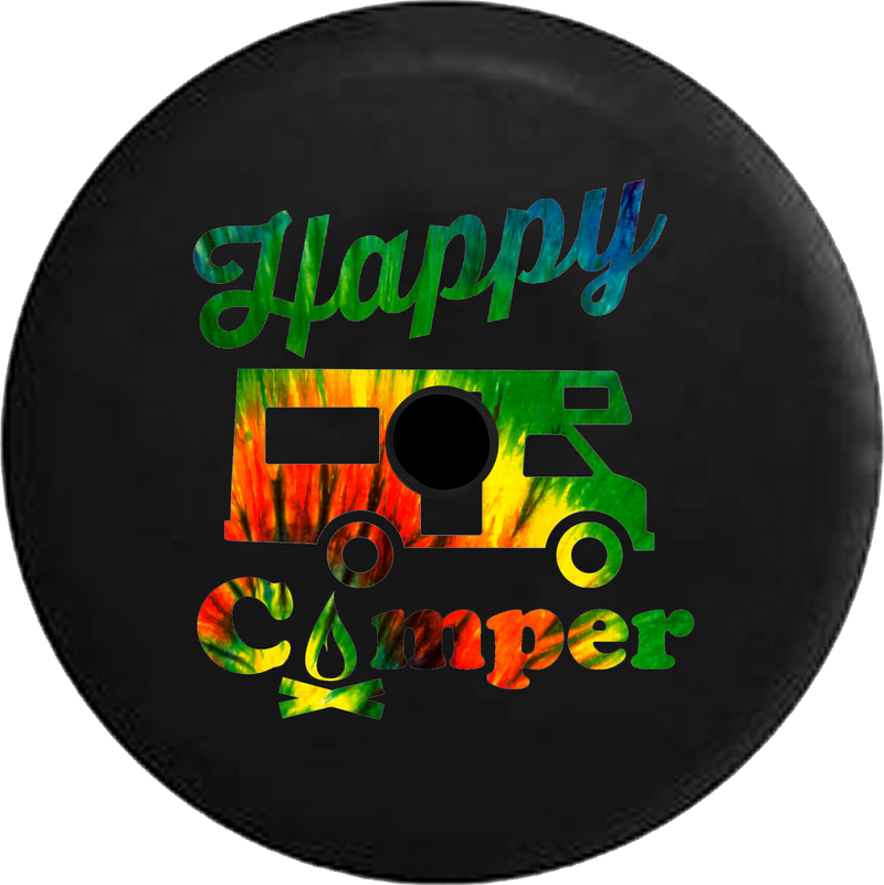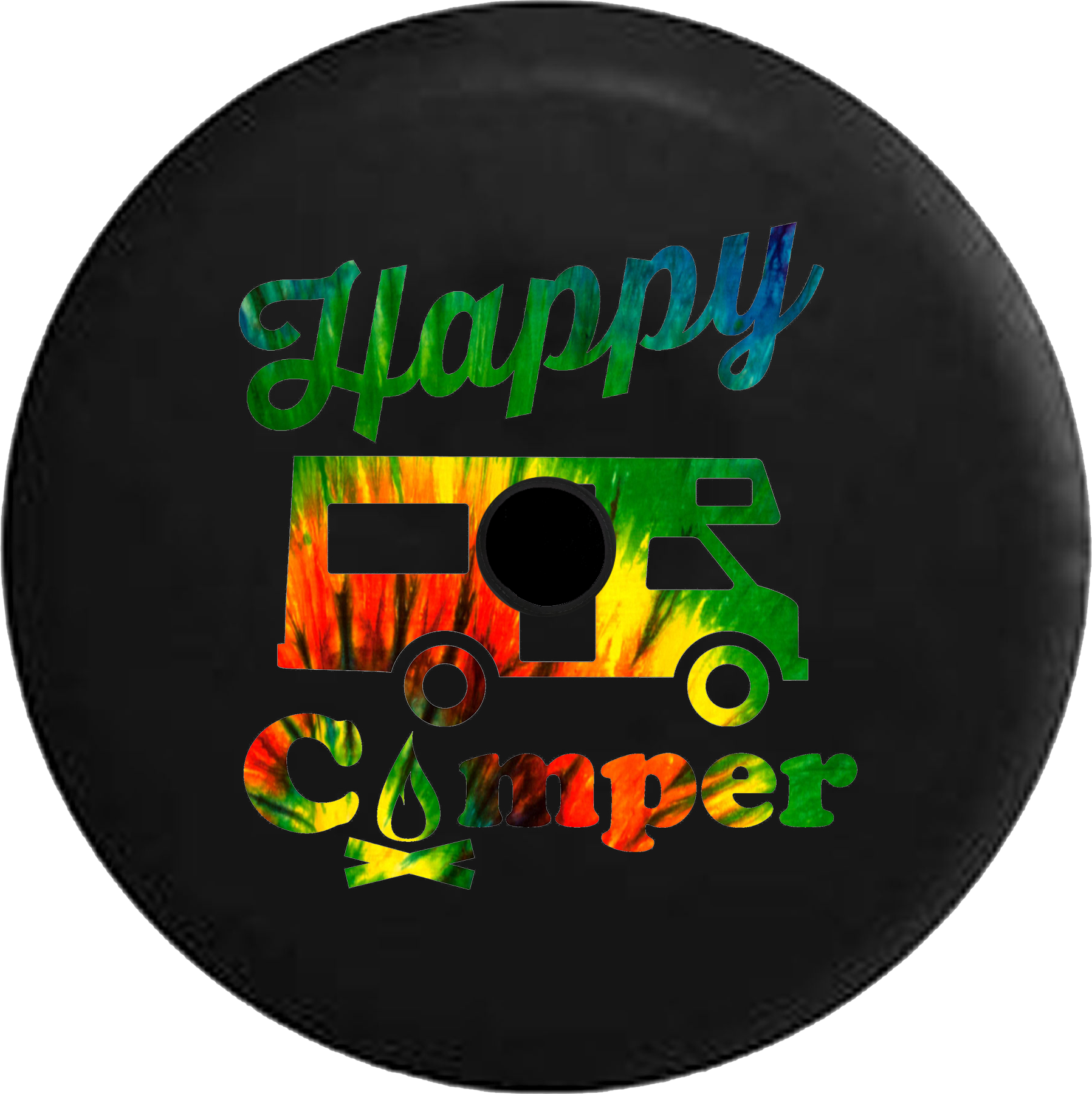 Jeep Wrangler JL Backup Camera Happy Camper Campfire RV Tie dye Spare Tire Cover-BLACK-