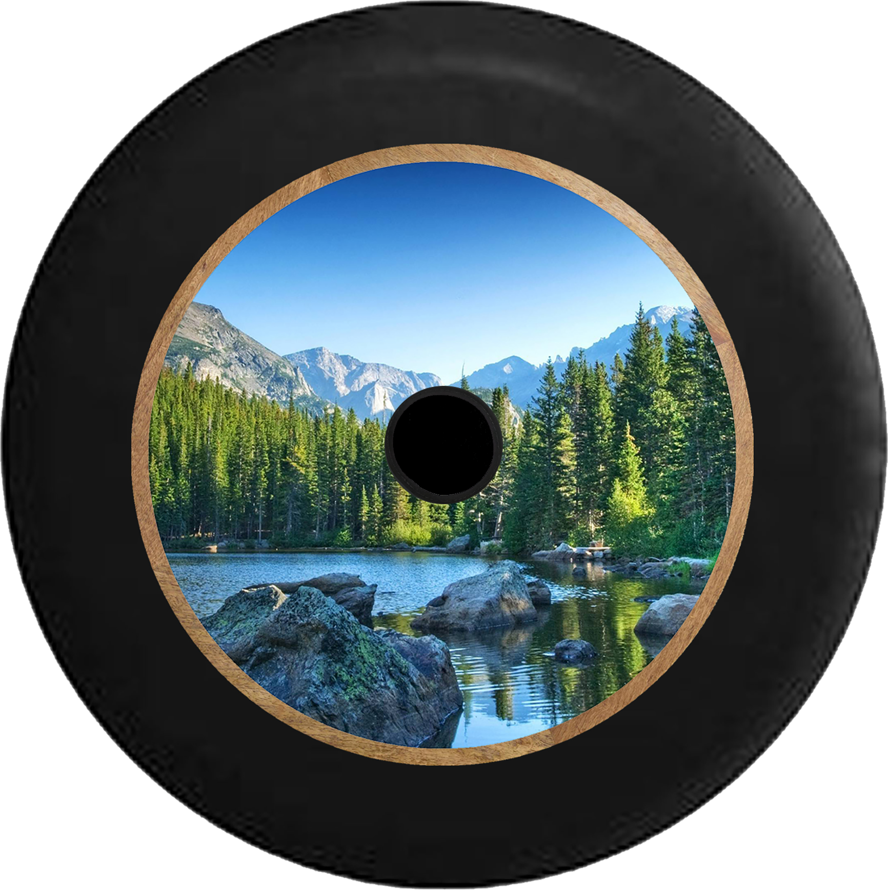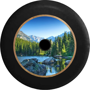 Jeep Wrangler JL Backup Camera Rocky Mountain Pines Tree line Lake Jeep Camper Spare Tire Cover BLACK- - R349