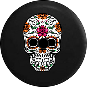 Jeep Wrangler JL Backup Camera Sugar Skull Tattoo with Hair RV Camper Spare Tire Cover-BLACK-