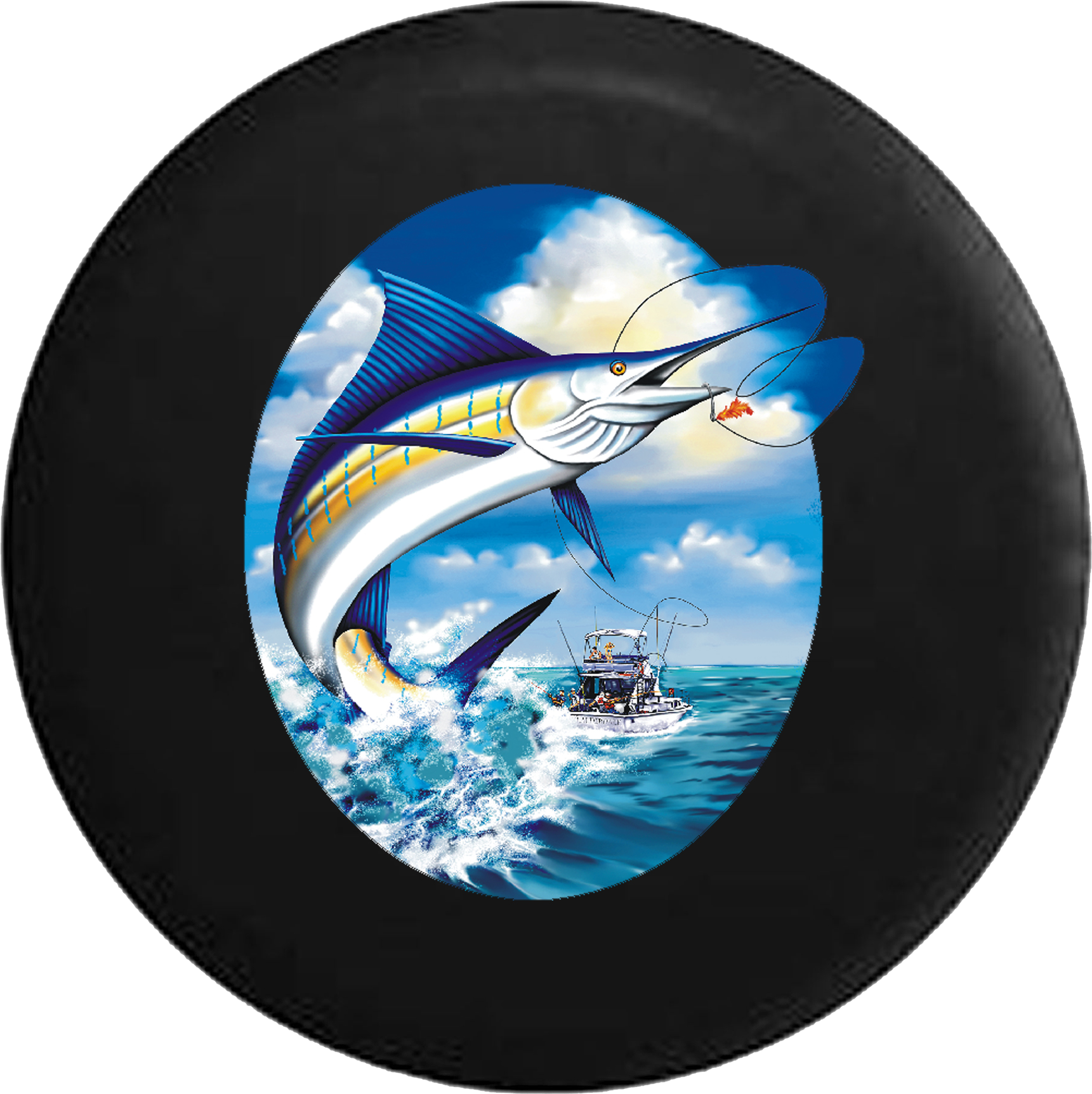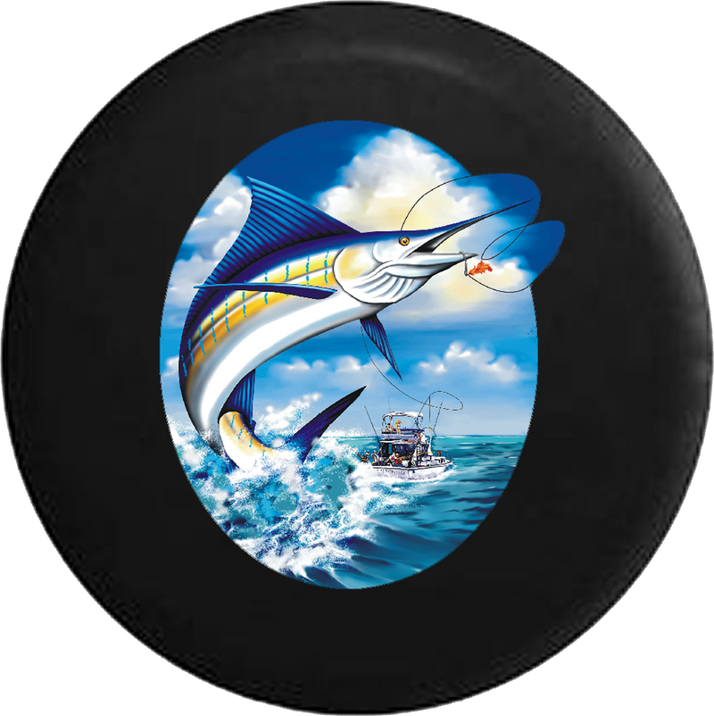 Marlin Leaping after Fishing Lure on Charter RV Camper Spare Tire Cover-BLACK- -V224